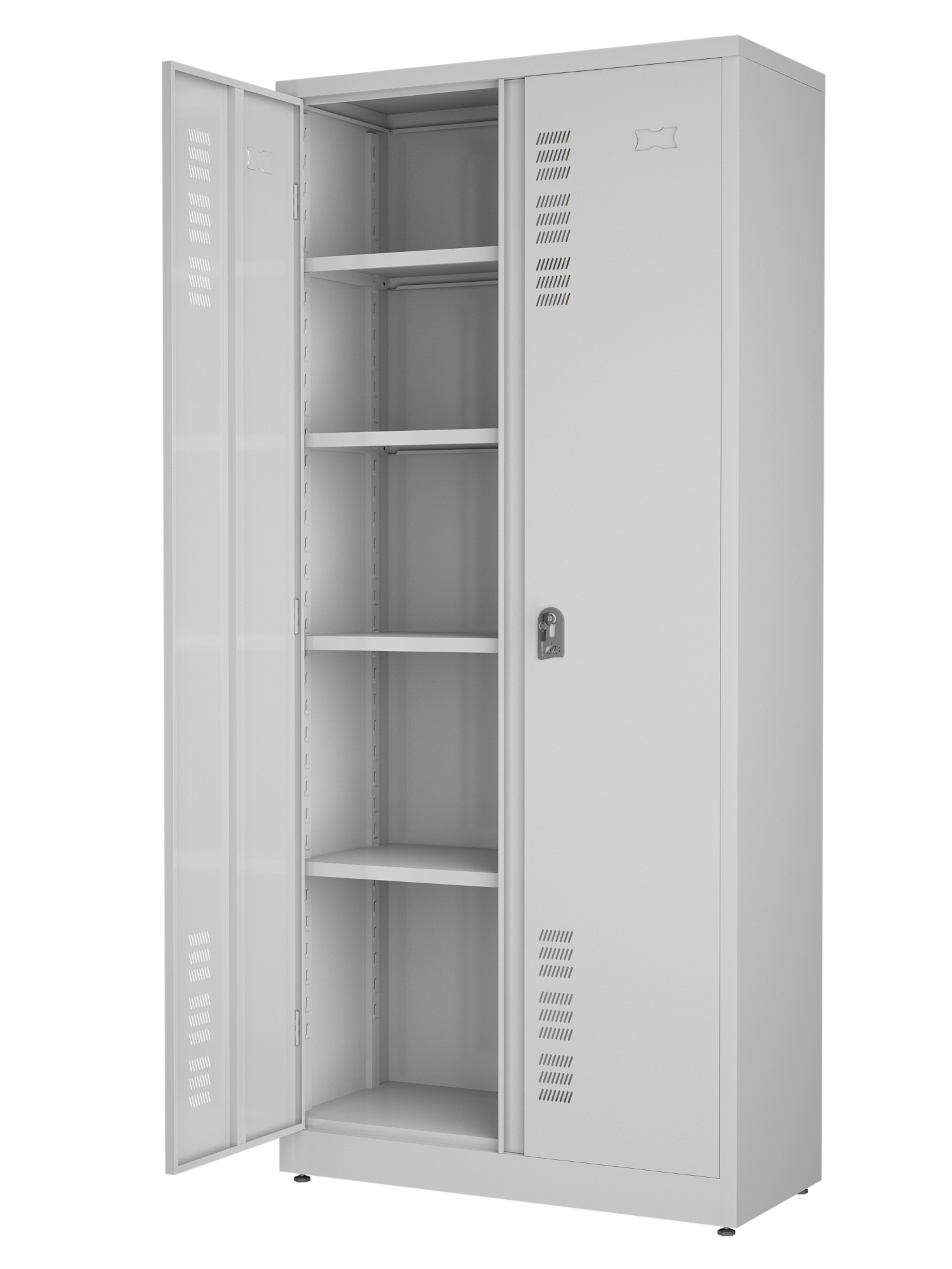 Móvel com puxador estampado verticalmente. Estampas nas portas que permitem ventilação.