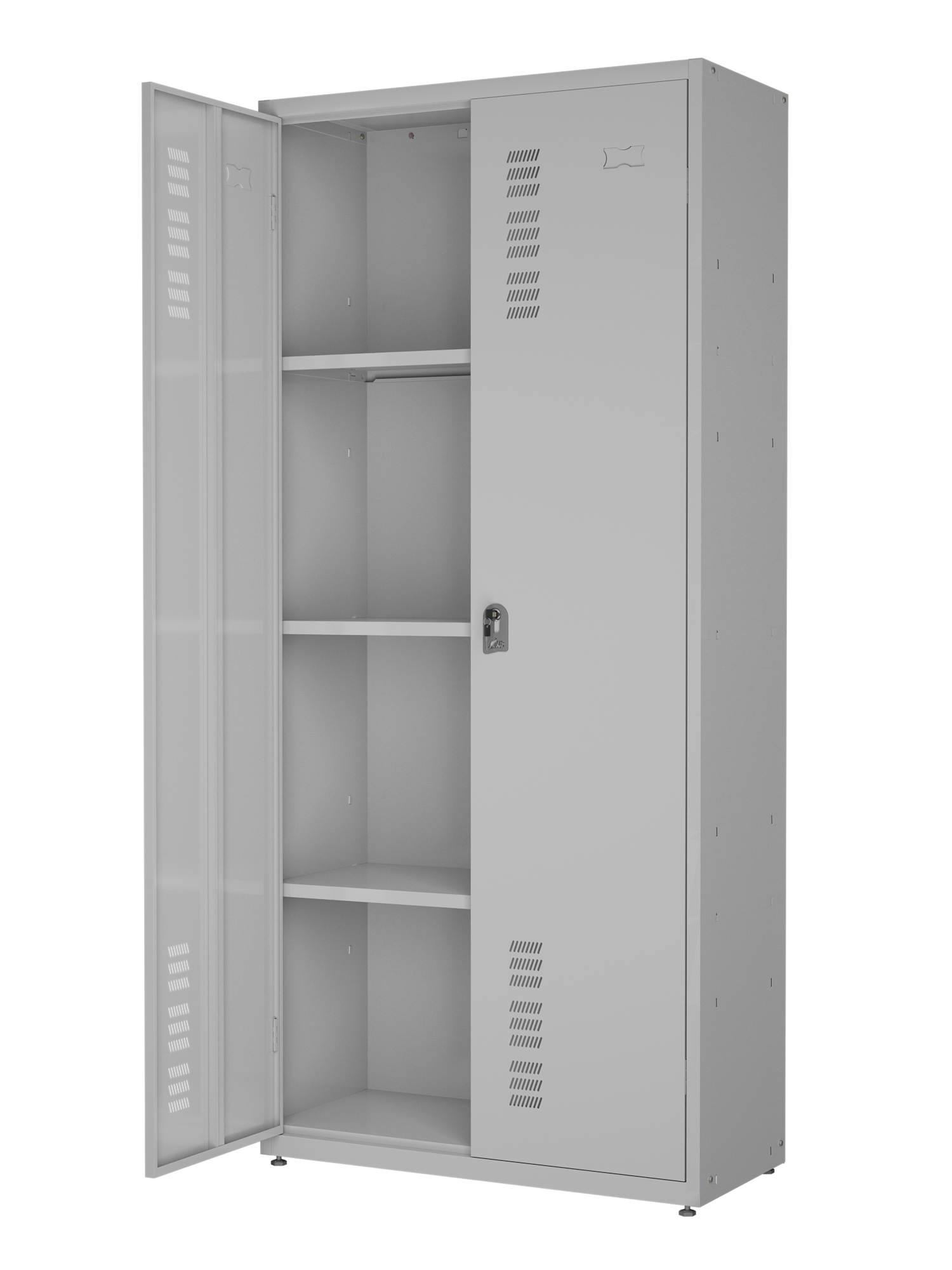 Móvel com puxador estampado verticalmente. Estampas nas portas que permitem ventilação.