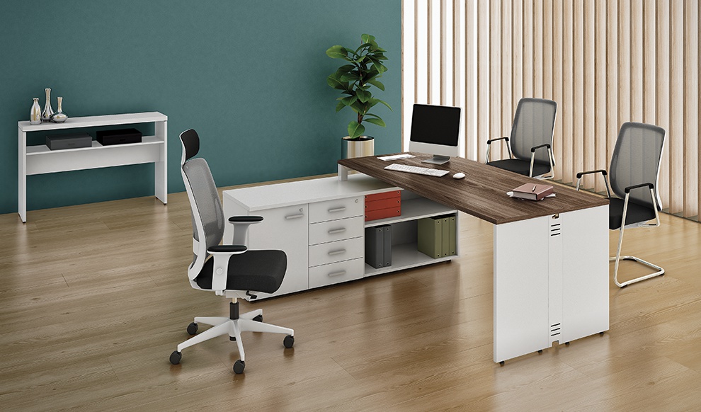 Mesa para atendimento de escritório com porta e gavetas